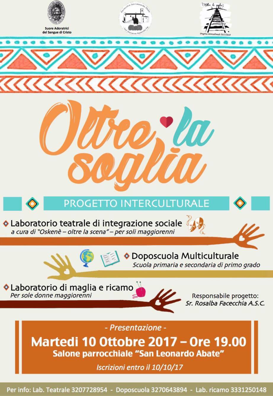 Il 10 ottobre 2017, alle ore 19,00, presso il Salone Parrocchiale della Chiesa Madre San Leonardo Abate, in Piazza Padre Pio, avrà luogo la presentazione del Progetto Interculturale “Oltre la Soglia”.