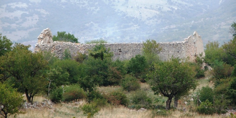 Il portale di ingresso a tutto sesto in pietra calcarea tenera si presenta molto degradato dall’erosione degli agenti atmosferici e a stento si riesce a “decifrarne” la decorazione. Il portale è sormontato all’esterno da una cornice che presenta evidenti segni di spoliazione; essa poteva racchiudere un’epigrafe, magari insieme ad una scultura a basso rilievo. Sopra il portale vi è un semplice rosone circolare in pietra calcarea di cui si è conservata solo la parte inferiore. In prossimità dell’abside, la parete nord è più spessa e rinforzata all’esterno da ben tre contrafforti. L’abside (ad est) è caratterizzata da una semplice monofora romanica alta poco più di un metro e larga circa 40 cm. La parete risulta crollata nel tratto delle ultime due campate (cioè prossime all’abside), nel luogo ove era presente una porta secondaria. Addossati alla parete sud (in corrispondenza delle prime campate) vi sono due contrafforti. La parete risulta crollata anche nei pressi dello spigolo di facciata. Le pareti interne, un tempo affrescate, si presentano ormai prive persino dell’intonaco, lasciando scoperta la muratura, composta in pietra calcarea più o meno tenera. Sono squadrate le pietre utilizzate per gli archi, per gli spigoli dei muri e anche quelle utilizzate per le paraste che un tempo sostenevano le arcate della copertura. Le rimanenti parti della muratura sono composte da pietrame erratico.