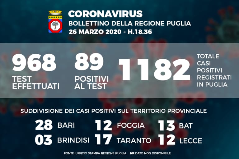 Regione Puglia, Michele Emiliano, sulla base delle informazioni del direttore del dipartimento Promozione della Salute Vito Montanaro, informa che oggi giovedì 26 marzo, in Puglia, sono stati effettuati 968 test per l’infezione Covid-19 coronavirus e sono risultati positivi 89 casi, così suddivisi: