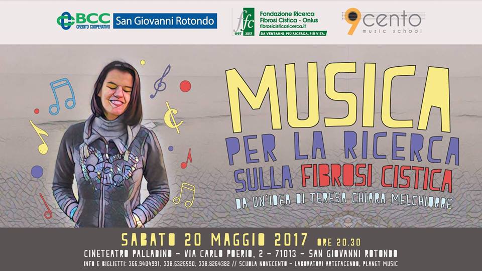 Sabato 20 maggio 2017, ore 20.30, appuntamento al Cineteatro Palladino di San Giovanni Rotondo (FG), in via Carlo Poerio 2, per il concerto benefico “Musica per la ricerca sulla fibrosi cistica”.