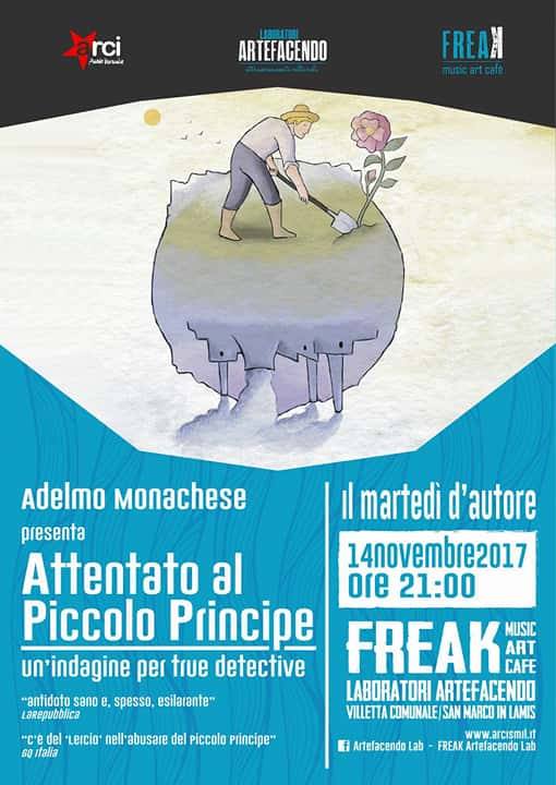 Meglio ancora: un’opera parodistica che fa il verso a più opere di finzione e ai principali riferimenti culturali dei nostri tempi, mischiati con elementi della cronaca e dell’attualità ma che fonda le basi della sua struttura comica sulla riscrittura comica de Il Piccolo Principe. L’opera è costituita da una parodia de Il Piccolo Principe in cui il ruolo del piccolo principe viene affidato all’attore premio Oscar Matthew McConaughey che per seguire questo nuovo “caso” si cala nuovamente nei panni del detective Rust Cohle , il personaggio interpretato nella serie tv di successo mondiale True Detective (di cui è in lavorazione una nuova stagione). La narrazione incrocia l’evolversi della storia e dell’interazione tra i due protagonisti de Il Piccolo Principe con l’indagine di True Detective che si sviluppa intorno ad un libro che esercita deleteri poteri su chi lo legge (Il Re giallo nella serie televisiva, Il Piccolo Principe in questa parodia). All’interno dell’opera la quasi totalità delle battute del personaggio del Piccolo Principe/Matthew McCounaghey/Rust Cohle sono riprese dalla serie tv. Un “montaggio”, in cui le battute del Piccolo Principe si alternano con quelle recitate dal detective Rust Cohle nel corso della serie tv, ponendo ogni battuta al di fuori del proprio contesto originario, una riscrittura comica all’interno di una narrazione surreale ma coerente con lo svolgimento della storia nel suo insieme con dei passaggi veramente esilaranti. Nei casi in cui i verbi risultano coniugati erroneamente con una formulazione più semplicistica di quella che sarebbe la forma più appropriata si è mantenuta la forma verbale originaria delle traduzioni italiane de Il Piccolo Principe. Bio autore Adelmo Monachese è autore dei collettivi di satira Lercio.it e Acidolattico.org Collabora con Libreriamo.it, Coolclub.it e ha collaborato con Smemoranda.it Ha scritto dal 2014 al 2016 su Libero Veleno, l’inserto satirico domenicale del quotidiano Libero. Il suo sito personale e canale youtube è: Ofalo.it La sua pagina Facebook è: Mon.Ade E’ in libreria con: Almanacco Luttazzi della nuova satira italiana (Feltrinelli, 2010, antologia) Un anno Lercio (Rizzoli, 2014, antologia) Inchiostro di Puglia (Caracò, 2015, antologia) I cuochi TV sono puttane (Rogas edizioni, 2015) Lercio – Lo sporco che fa notizia (Shockdom edizioni, 2017) Attentato al Piccolo Principe (Les Flaneurs edizioni, Settembre 2017) Tv Ha partecipato nel 2013 al programma di Rai3 dedicato alla scrittura “Masterpiece” classificandosi 10’ su 5000 partecipanti. Ha scritto e condotto la rubrica “Le classifiche impossibili” all’interno del programma tv dedicato ai libri “Il Libro Possibile Tv” in onda sul canale digitale e satellitare TgNorba24 nel 2017 Teatro Ha fatto parte della compagnia di teatro in vernacolo “La farsa” di Foggia Sta lavorando ad una commedia tratta da Attentato al Piccolo Principe che andrà in scena nell’inverno 2017 ad opera de la Piccola Compagnia Impertinente di Foggia Si è occupato del progetto social e web “Storytellme” ideato dal Teatro Pubblico Pugliese relativamente alla stagione 2016/2017 del Teatro Umberto Giordano di Foggia.