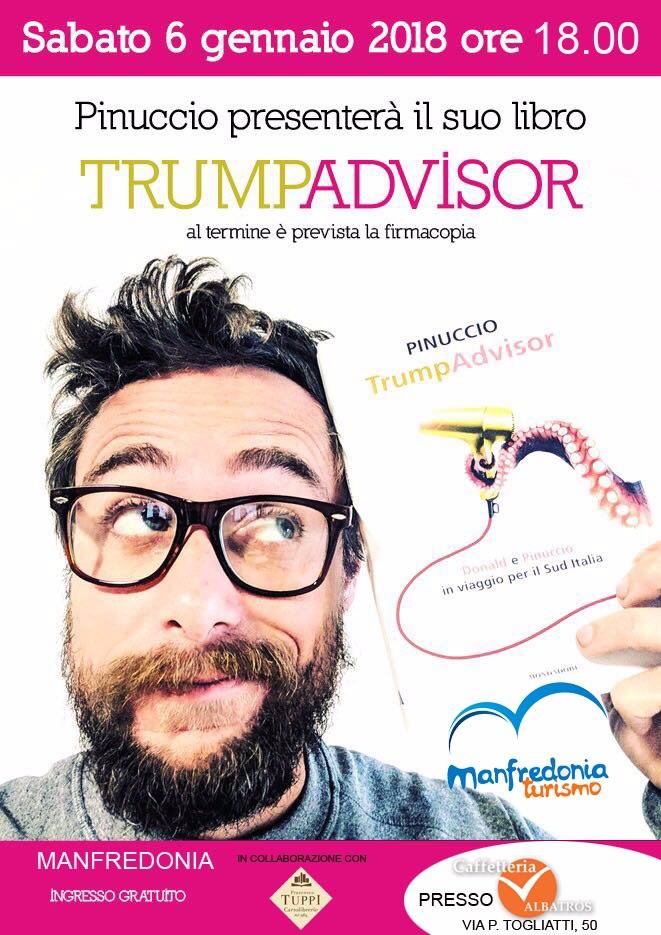 L’Epifania tutte le feste porta via! Il 6 gennaio porta con sè sempre un pò di tristezza e malinconia per il termine del periodo natalizio ed il ritorno alla quotidianità. Ma, quest’anno a Manfredonia a portare buonumore e spensieratezza ci pensa Pinuccio, l’esilarante web star pugliese ed inviato di “Striscia la Notizia” che presenterà “TrumpAdvisor, Donald e Pinuccio in viaggio per il Sud Italia”, pubblicato da Mondadori lo scorso 14 novembre e che grande successo sta riscuotendo in tutt’Italia.