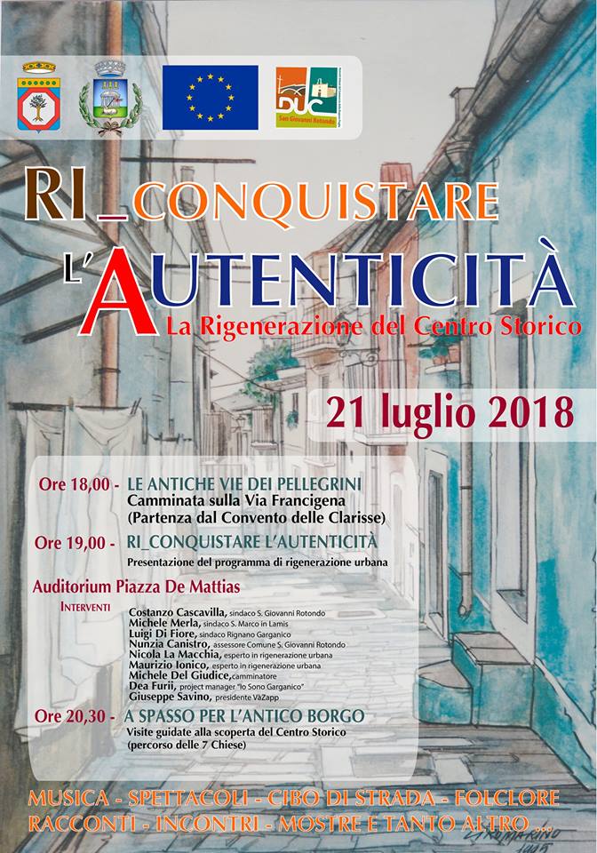 La giornata dedicata alla “riconquista dell’autenticità” prevede alle ore 18.00 la camminata (partenza dal convento delle Clarisse) sull’antico cammino della Via Francigena, per raggiungere il centro storico, dove alle ore 19.00, in piazza de Mattias, si svolgerà il convegno “Ri_conquistare l’Autenticità“, con la partecipazione di relatori ed esperti, sul tema della rigenerazione urbana. Sono previsti gli interventi di Costanzo Cascavilla (sindaco di San Giovanni Rotondo), Michele Merla (sindaco San Marco in Lamis), Luigi Di Fiore (sindaco Rignano Garganico), Nunzia Canistro (assessore con delega al centro storico del Comune San Giovanni Rotondo), Maurizio Ionico e Nicola La Macchia (esperti in rigenerazione urbana), Michele Del Giudice (camminatore), Dea Furii (project manager “Io sono Gargano”) e Giuseppe Savino, presidente VàZapp.