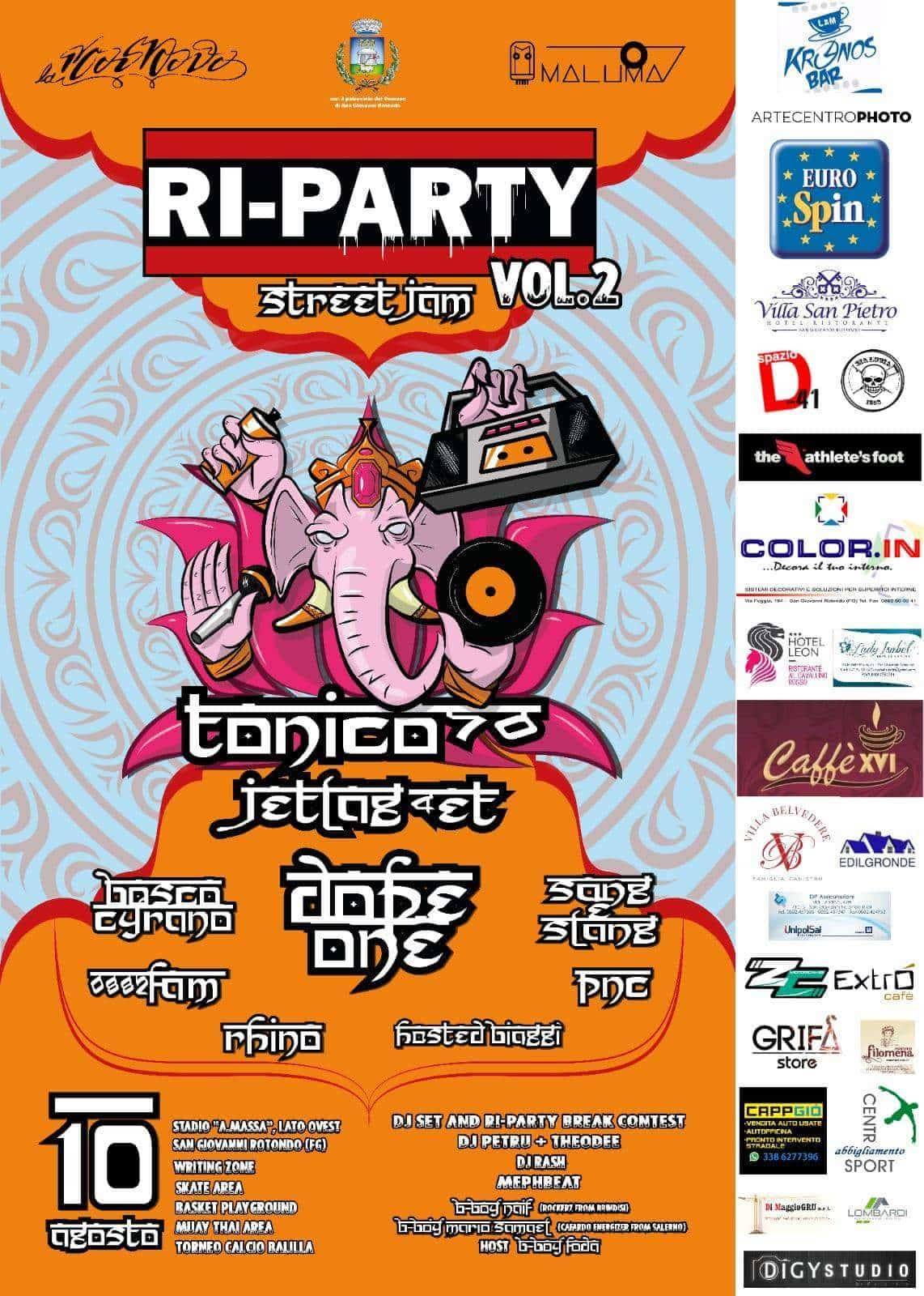 Programma ufficiale RI-PARTY STREET JAM VOL.2 : pagina Facebook dell’evento. Vi aspettiamo Venerdì 10 Agosto 2018, presso lo Stadio Comunale “Antonio Massa” Viale Della Gioventù, San Giovanni Rotondo (FG). Tutta la cittadinanza è invitata a partecipare!