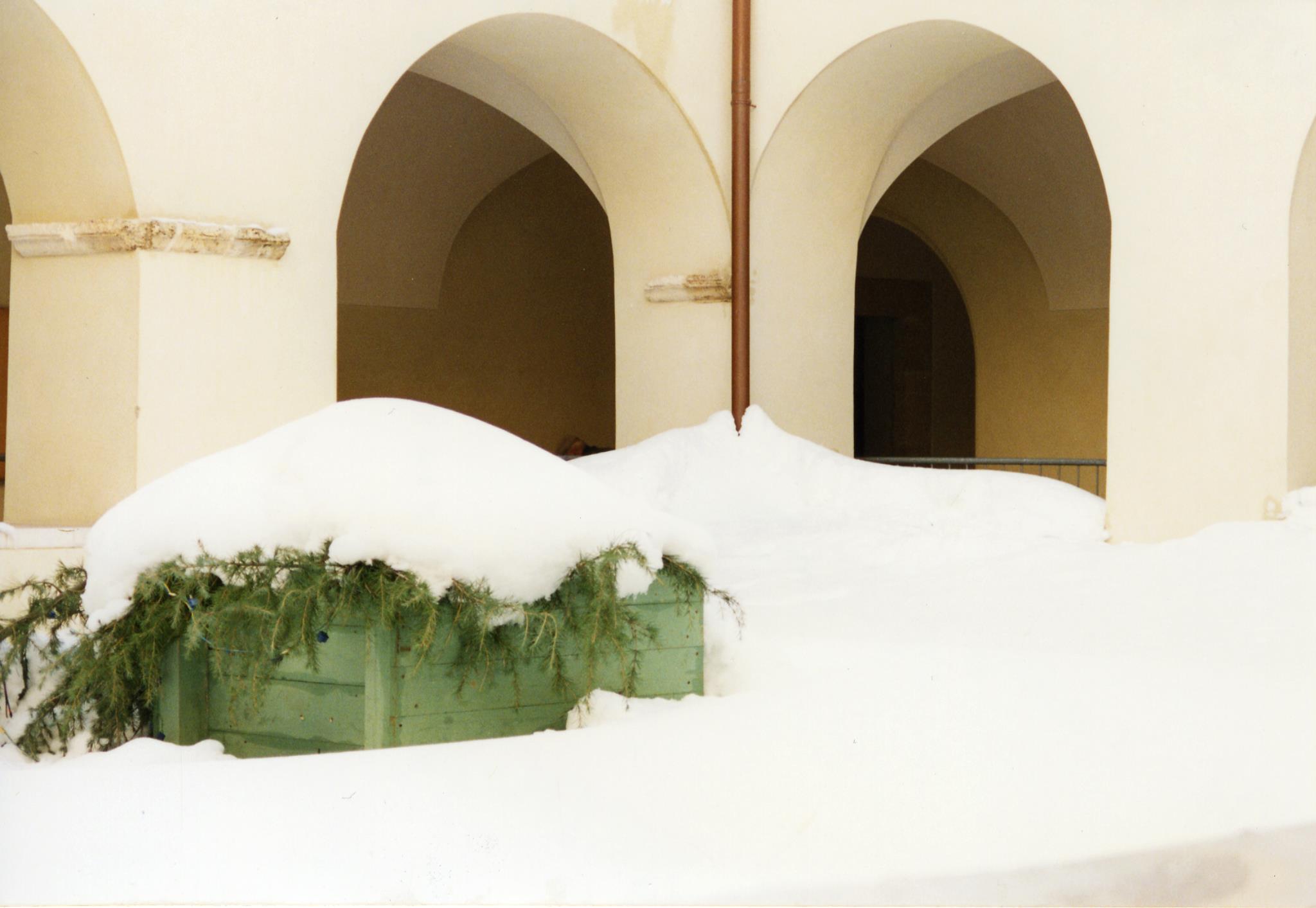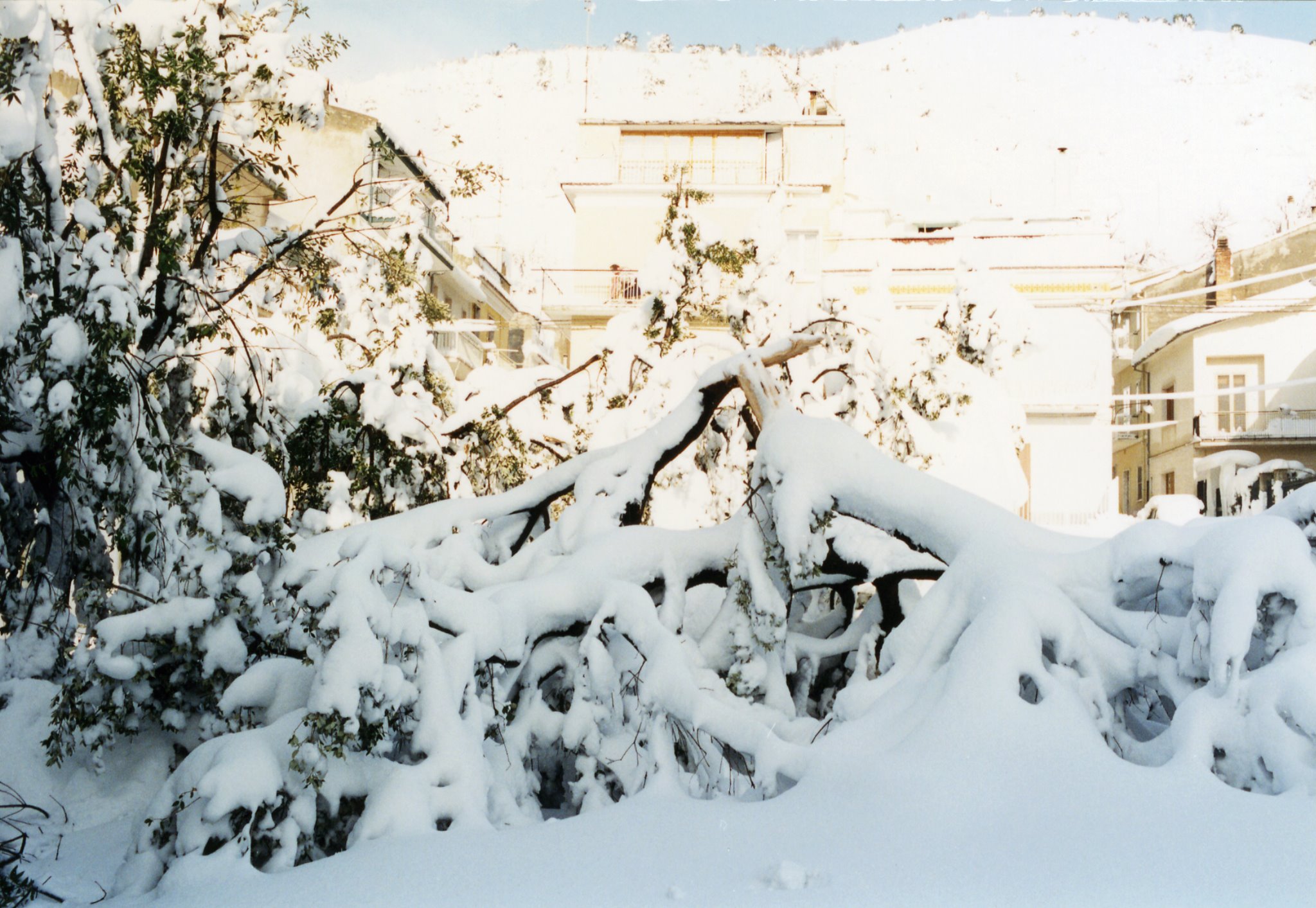 Dopo una mezz’ora vado a letto ma non resisto molto, verso le 7:30 mi alzo e scopro che la situazione è ancora più incredibile: i balconi esposti a nord sono pieni di neve fino all’altezza del mancorrente della ringhiera parapetto, le strade sono impraticabili, le auto sommerse, gli alberi sempre verdi hanno subito ingenti danni per il peso della neve.