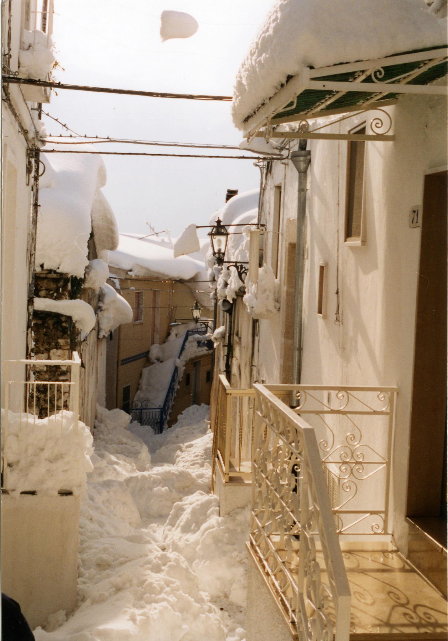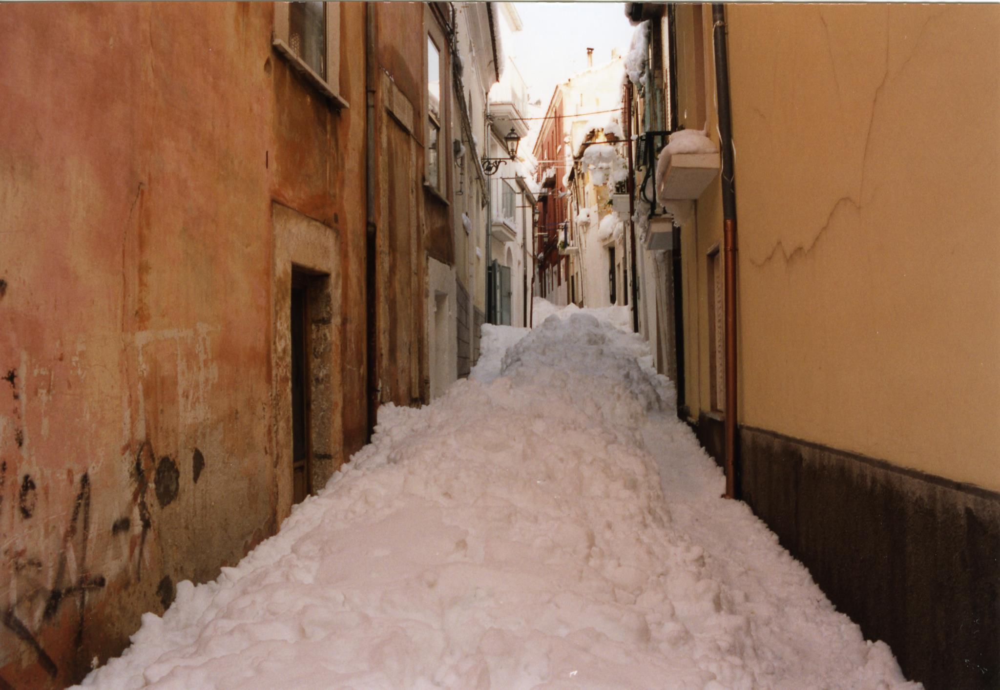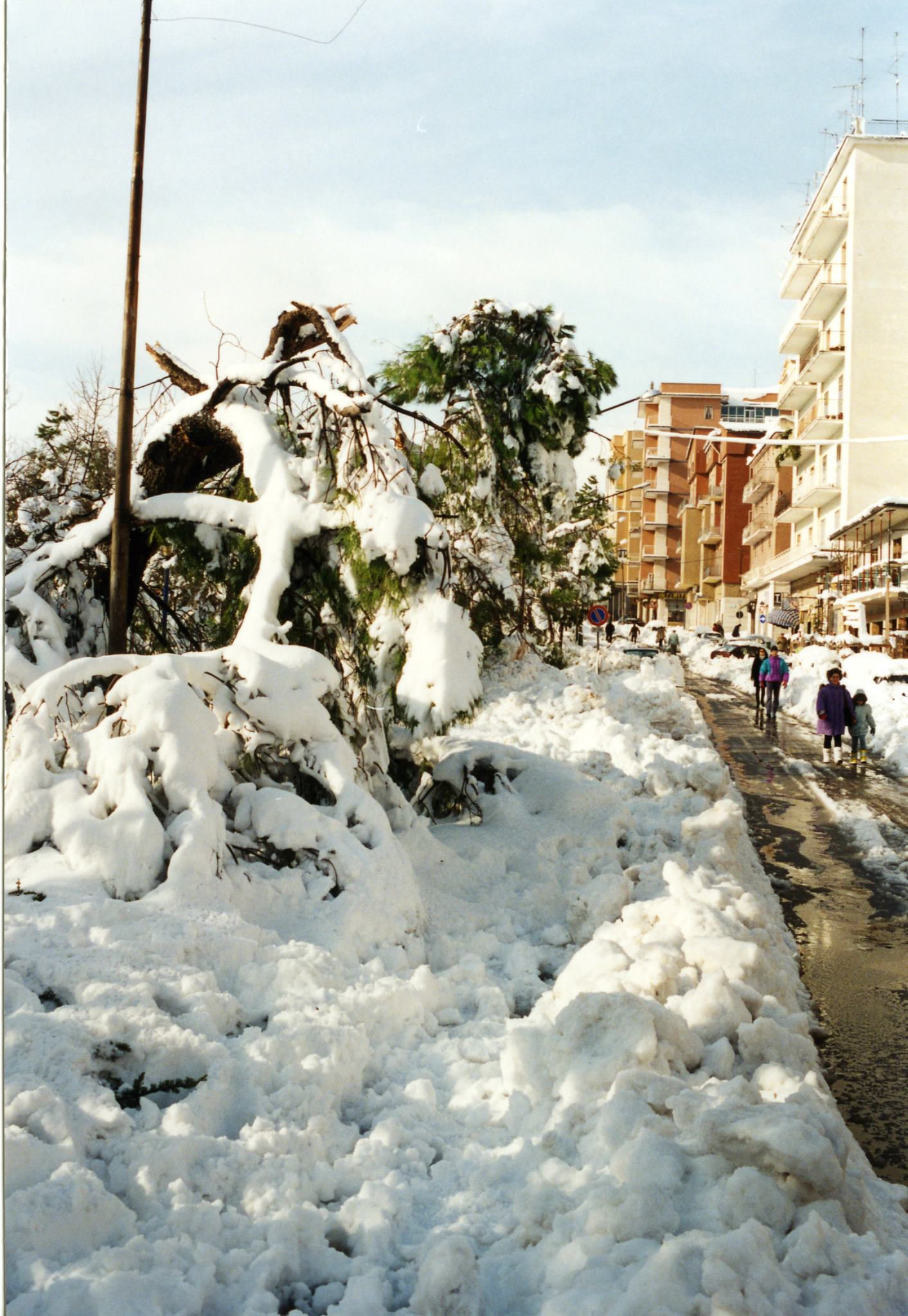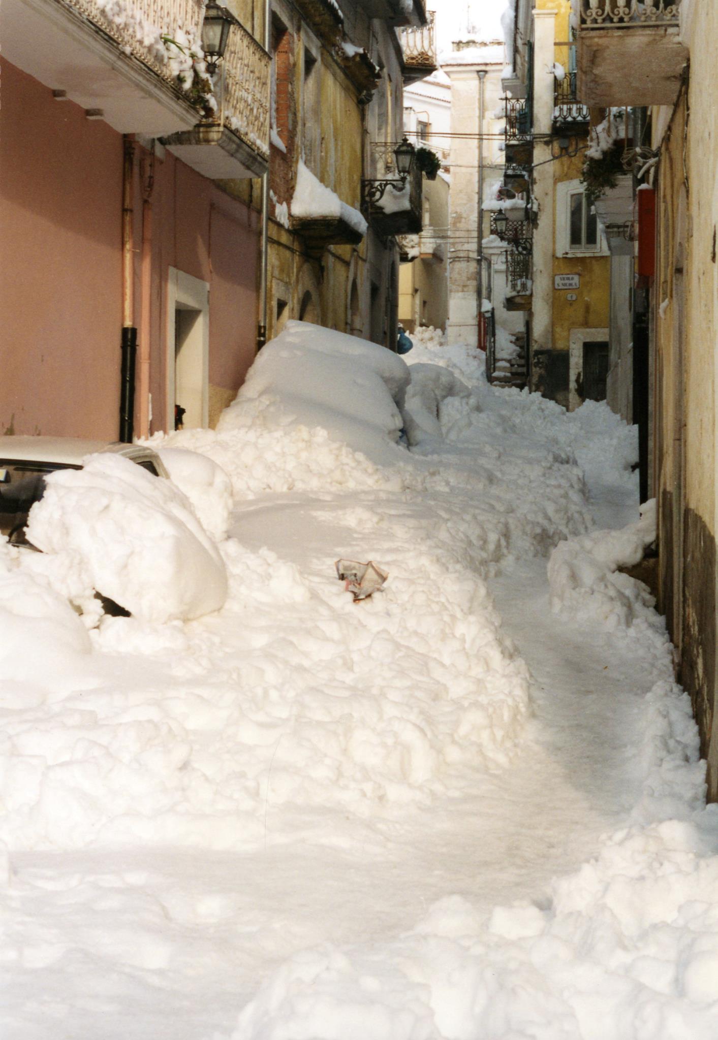 Verso le 10:00 esco con mio zio, mia cugina, il cane, e l’immancabile”carburante” (la bottiglietta di grappa); già aprire il portone e il cancello di casa è un’impresa titanica (vista la quantità di neve da spostare: all’apertura del portone mi si presenta davanti ad un muro di circa90-100cm di neve), inoltre il cane è di piccola taglia per cui ha difficoltà ad avanzare. La prima neve era molto pesante infatti si è notevolmente compattata (non dimentichiamo che fino al pomeriggiodel4 gennaio la neve tendeva parzialmente a sciogliersi) e si cammina sopraelevati di30-40cm rispetto al piano stradale, mentre al riparo dal vento, la neve, si ammucchia in cumuli più soffici che si avvicinano e a volte superano il metro e trenta di altezza. Procediamo verso Piazza Europa (il termometro elettronico non funziona più) gli abeti sono tutti semi-distrutti dal peso enorme della neve, lo scenario fa anche un po’ paura perché continua a nevicare molto intensamente e non si vedono auto,né fuoristrada,né mezzi spartineve,inoltre solo poche persone si avventurano per strada Procediamo, senza cambiamenti di scenario ,in Corso Umberto, poi in Viale Kennedy, e poi svoltiamo a sinistra in Via della Sapienza,a un certo punto mi rendo conto di camminare su qualcosa di duro, ma di cosa si tratta? È una Fiat 500 vecchio tipo (altezza 1,33m) completamente seppellita dalla neve. In Via della Sapienza c’è un muro di cinta con vicino una fontana(che adesso non c’è più) dell’Acquedotto Pugliese (altezza 1,28m): la fontana è appena visibile e la neve arriva quasi alla sommità del muro di cinta (circa1,40m di altezza dal piano stradale).