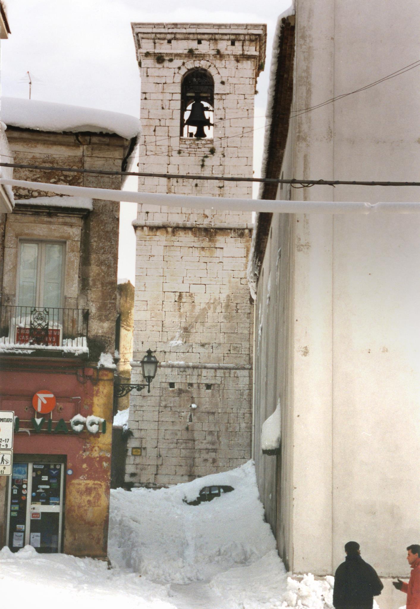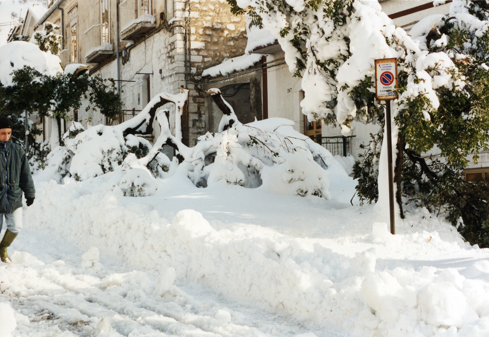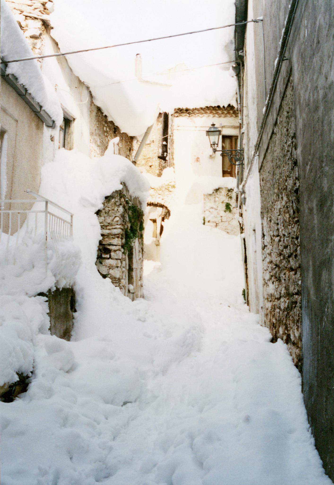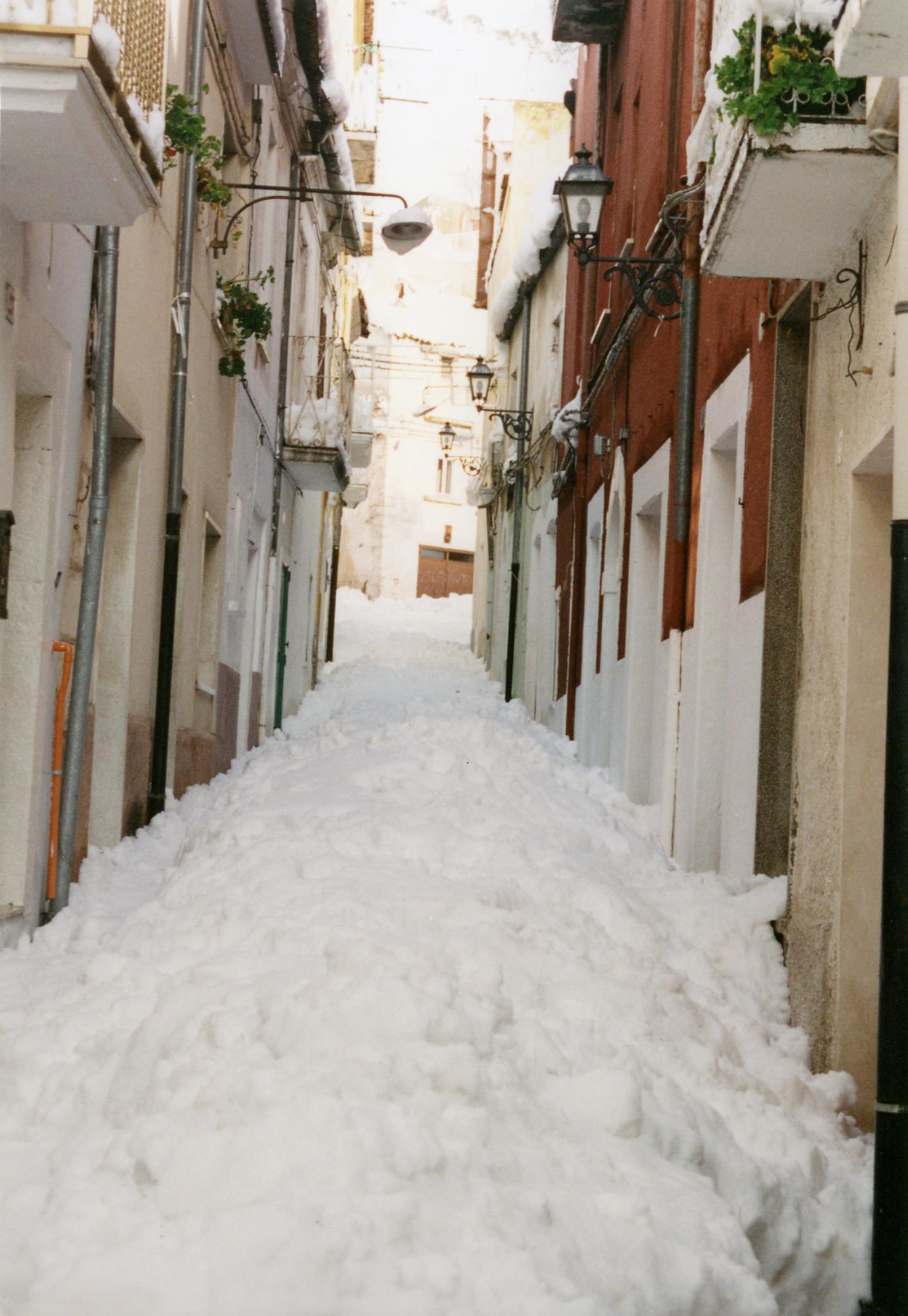 Verso le 10:00 esco con mio zio, mia cugina, il cane, e l’immancabile”carburante” (la bottiglietta di grappa); già aprire il portone e il cancello di casa è un’impresa titanica (vista la quantità di neve da spostare: all’apertura del portone mi si presenta davanti ad un muro di circa90-100cm di neve), inoltre il cane è di piccola taglia per cui ha difficoltà ad avanzare. La prima neve era molto pesante infatti si è notevolmente compattata (non dimentichiamo che fino al pomeriggiodel4 gennaio la neve tendeva parzialmente a sciogliersi) e si cammina sopraelevati di30-40cm rispetto al piano stradale, mentre al riparo dal vento, la neve, si ammucchia in cumuli più soffici che si avvicinano e a volte superano il metro e trenta di altezza. Procediamo verso Piazza Europa (il termometro elettronico non funziona più) gli abeti sono tutti semi-distrutti dal peso enorme della neve, lo scenario fa anche un po’ paura perché continua a nevicare molto intensamente e non si vedono auto,né fuoristrada,né mezzi spartineve,inoltre solo poche persone si avventurano per strada Procediamo, senza cambiamenti di scenario ,in Corso Umberto, poi in Viale Kennedy, e poi svoltiamo a sinistra in Via della Sapienza,a un certo punto mi rendo conto di camminare su qualcosa di duro, ma di cosa si tratta? È una Fiat 500 vecchio tipo (altezza 1,33m) completamente seppellita dalla neve. In Via della Sapienza c’è un muro di cinta con vicino una fontana(che adesso non c’è più) dell’Acquedotto Pugliese (altezza 1,28m): la fontana è appena visibile e la neve arriva quasi alla sommità del muro di cinta (circa1,40m di altezza dal piano stradale).