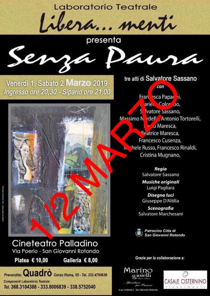 “Siate pronti..e senza paura” Pochi giorni ancora ed andrà in scena “Senza Paura” dalla penna di Salvatore Sassano, al suo quinto lavoro in veste di autore (Lu iurne chiù brutte, Tutte passa, La notte è la mia, Lu Rè) che quest’anno firmerà anche la regia.