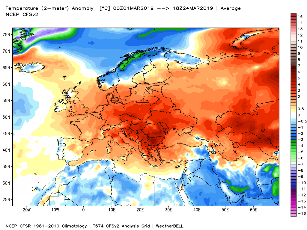 Da martedì tornerà un po’ di freddo, ma non sarà nulla di eclatante. A dire il vero, dopo un febbraio più mite della media (link immagine), anche il mese corrente ha avuto molte fasi con temperature oltre la media storica (vedi immagine qui sotto).