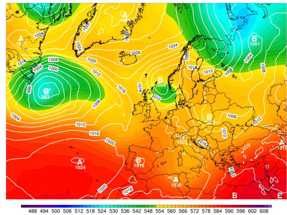 Con una carta meteorologica possiamo comprendere meglio le cause della mancata stabilità: i colori più accesi indicano la presenza di una pressione più alta (o, meglio, una colonna d’aria dove le correnti sono discendenti e quindi “premendo” l’aria verso il basso garantiscono un tempo migliore) che se ne sta lontana dalla penisola; per le perturbazioni è abbastanza semplice tuffarsi o comunque influenzare il tempo sul nostro settore il quale è meno protetto del solito.
