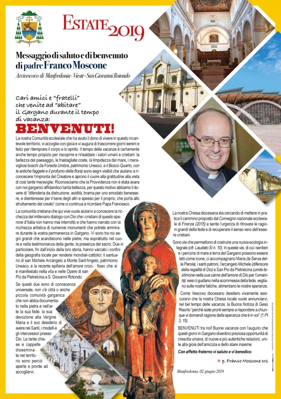 Il tempo delle vacanze è certamente anche tempo propizio per riscoprire e rinsaldare i valori umani e cristiani: la bellezza del paesaggio, le frastagliate coste, la limpidezza del mare, i meravigliosi boschi (la Foresta Umbra, patrimonio Unesco, e il Bosco Quarto, con le antiche faggete e il profumo della flora) sono segni visibili che aiutano a riconoscere l’impronta del Creatore e aprono il cuore alla gratitudine alla vista di così tante meraviglie.