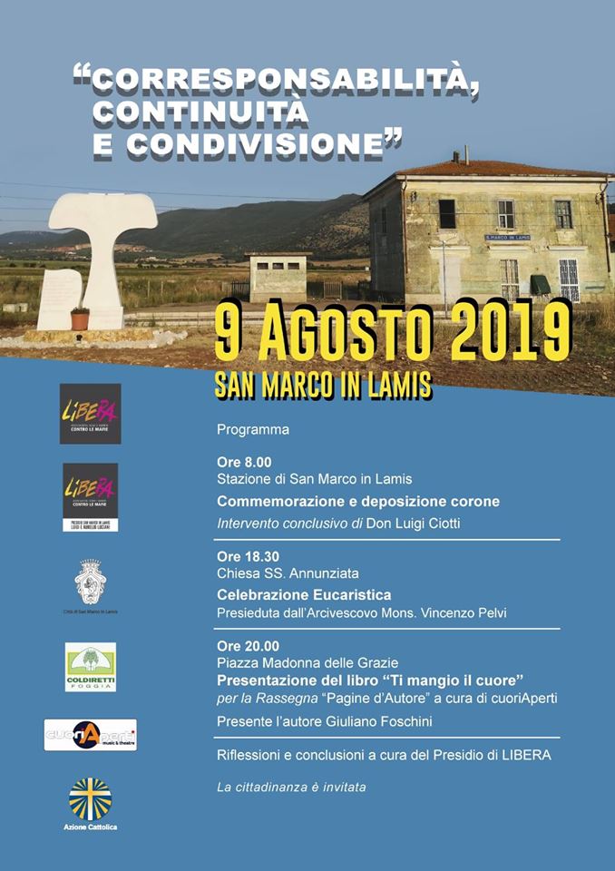 – ore 8, momento di riflessione e commemorazione presso la stele innalzata nella vecchia stazione di San Marco in Lamis, luogo in cui è avvenuta la strage, con interventi delle Istituzioni, dei familiari e le conclusioni di don Luigi Ciotti, presidente di Libera.
