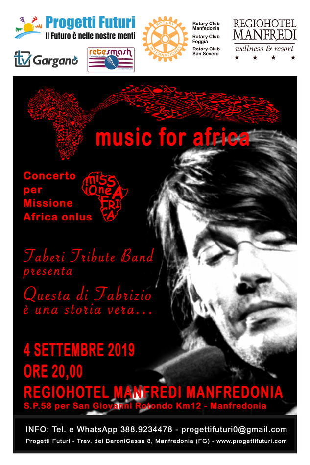 Il 4 settembre 2019 ore 20:00 tributo a Fabrizio De Andrè dal titolo “Questa di Fabrizio è una storia vera…” eseguito dalla Faberi Tribute Band presso il RegioHotel Manfredi di Manfredonia (FG).