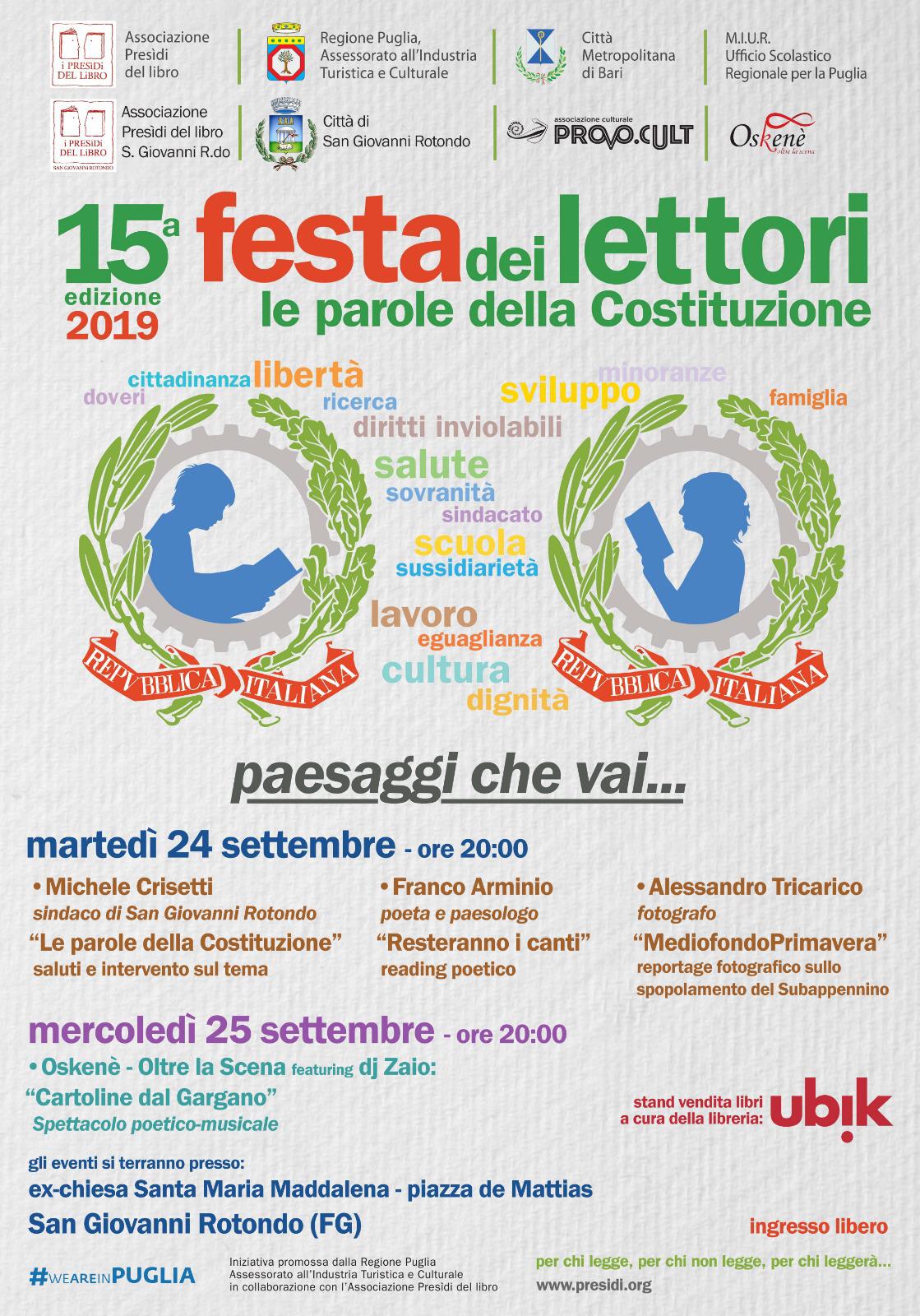 “Le Parole della Costituzione” è il tema della 15esima edizione della Festa dei Lettori e la parola Paesaggio (art.9 della nostra Costituzione) è quella scelta dal Presidio di San Giovanni Rotondo, che sarà raccontata attraverso le diverse forme d’arte dei vari artisti che animeranno la manifestazione: dalla poesia alla fotografia, dal teatro alla musica.