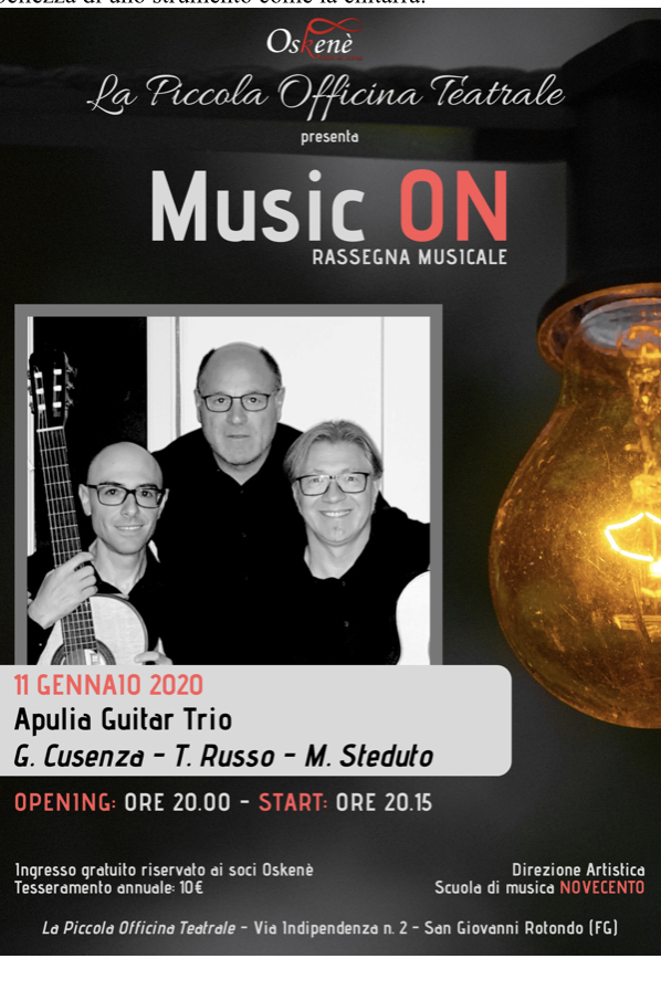 Dopo lo straordinario concerto per basso solo del M° Viz Maurogiovanni il sipario dalla rassegna si aprirà per l’Apulia Guitar Trio, la formazione chitarristica formata da Giovanni Cusenza, Tobia Russo e Michele Steduto.