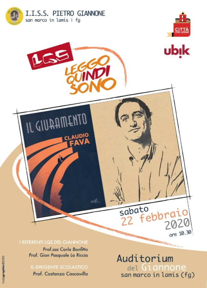 Inizia così il percorso narrativo interessante ed emozionante de Il giuramento, il romanzo che Claudio Fava presenterà ai giovani lettori del Giannone il prossimo 22 febbraio. Deputato ed eurodeputato, giornalista e sceneggiatore di successo, l’ospite della scuola sammarchese è il figlio di Giuseppe Fava, nome di spicco del giornalismo siciliano assassinato dalla mafia nel 1984, ed è stato lo sceneggiatore del film I cento passi con Marco Tullio Giordana.