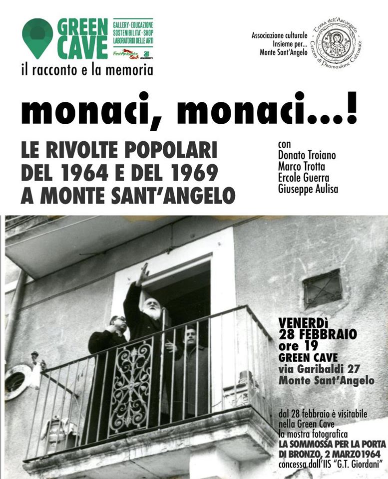 L’incontro, in programma il 28 febbraio 2020 alle ore 19 nella Green Cave, è promosso da Legambiente e dall’associazione culturale “Insieme Per…”. Dopo una relazione introduttiva di Donato Troiano, interverranno lo storico Marco #Trotta e Giuseppe #Aulisa, del direttivo di Legambiente FestambienteSud. In conclusione anche la presentazione, a cura di Ercole Guerra, dell’associazione “Insieme Per…”, de “La sommossa per la porta di bronzo, 2 marzo 1964”, una mostra di documentazione fotografica e storica curata qualche anno fa dagli studenti del liceo scientifico di Monte Sant’Angelo. La mostra, su gentile concessione dell’IIS Guan Tommaso Giordani, sarà visitabile nella Green Cave dal 28 febbraio fino a tutto il mese di marzo 2020.