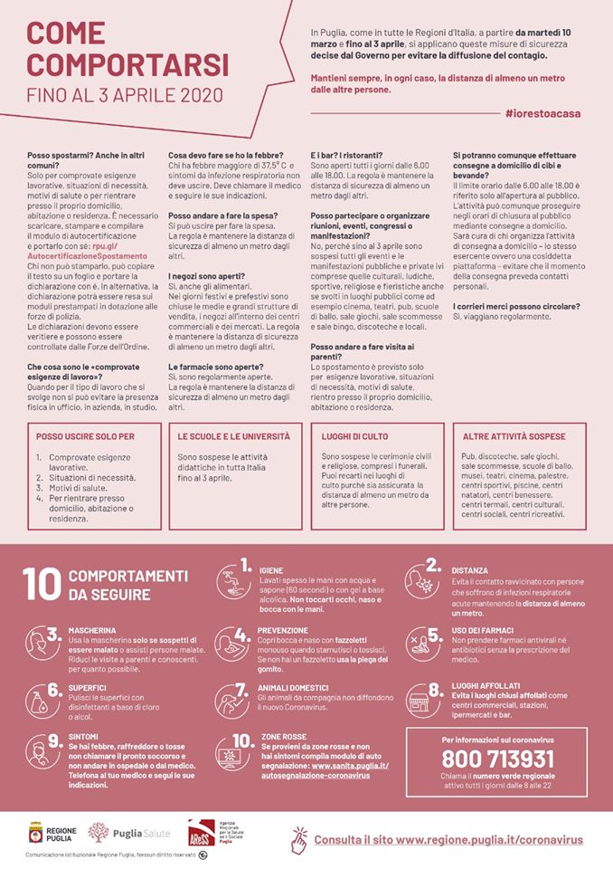 Si raccomanda di restare in casa e uscire solo per comprovate esigenze lavorative, situazioni di necessità, motivi di salute o per rientrare presso il proprio domicilio. In ogni caso mantenere sempre la distanza di almeno un metro dalle altre persone.