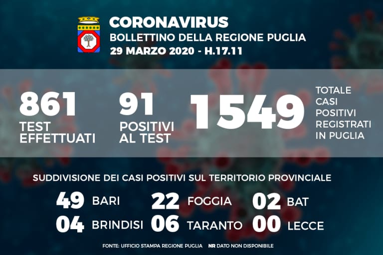 Il presidente della Regione Puglia, Michele Emiliano, sulla base delle informazioni del direttore del dipartimento Promozione della Salute Vito Montanaro, informa che oggi domenica 29 marzo, in Puglia, sono stati effettuati 861 test per l’infezione Covid-19 coronavirus e sono risultati positivi 91 casi, così suddivisi: