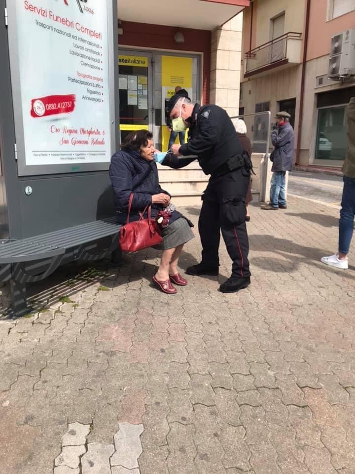 Un carabiniere passa davanti l’ufficio postale e nota una signora anziana che, seduta su una panchina, è in attesa di entrare per ritirare la sua pensione. Si accorge che non ha la mascherina e gliela procura. Ma non si limita a questo: si preoccupa di fargliela indossare correttamente. È tutto racchiuso in questo scatto commovente immortalato dalla nostra concittadina Katya Marzano, diventato virale in poche ore.