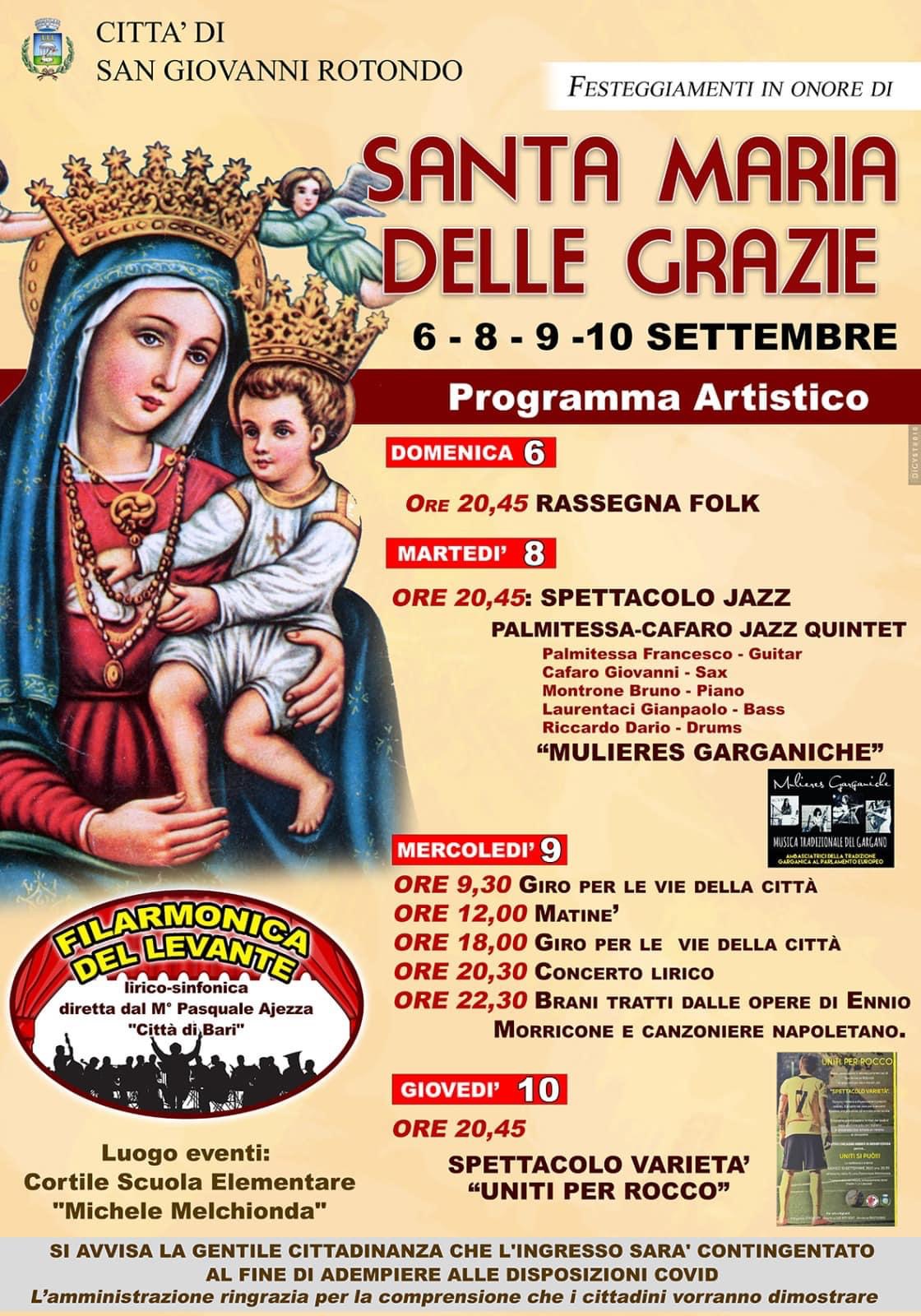 A causa del particolare periodo storico che stiamo vivendo, il programma artistico della festività di Santa Maria delle Grazie si svolgerà nel cortile della scuola elementare “Michele Melchionda”. Si avvisa la cittadinanza che l’ingresso sarà contingentato e tutto si svolgerà nel pieno rispetto delle disposizioni anticovid.