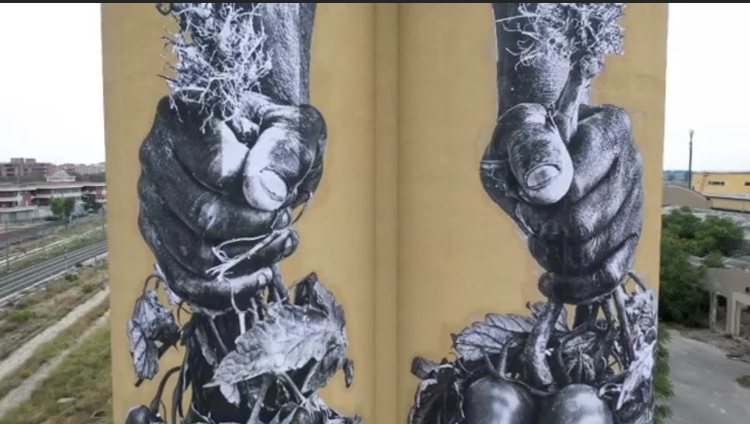 Realizzato in ricordo dei 16 braccianti morti due anni fa, con un’immagine che rappresenta l’ultimo gesto che hanno compiuto poco prima di morire.