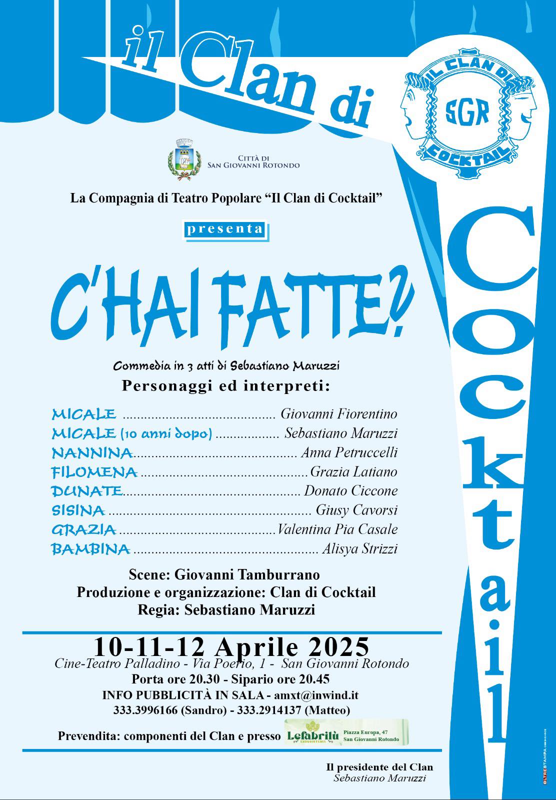 Con entusiasmo e gioia annunciamo che dopo 6 anni di assenza, finalmente torna in scena la storica compagnia di teatro popolare “Il Clan di cocktail” con la nuova e brillante commedia in 3 atti di Sebastiano Maruzzi dal titolo “C’hai fatte?”.