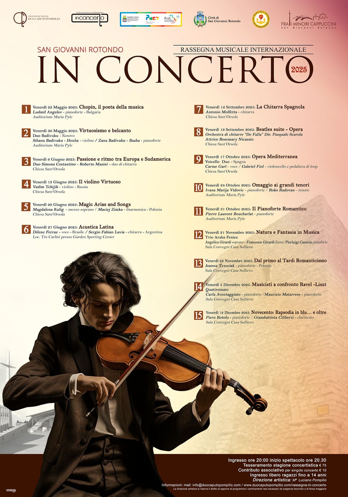 Il Violino Virtuoso è il titolo del concerto in programma nella suggestiva cornice della chiesa di Sant’Orsola a San Giovanni Rotondo, venerdì 13 giugno alle ore 20, nel cartellone artistico della 21esima edizione della Rassegna Musicale Internazionale InConcerto (diretta e ideata dal Maestro Luciano Pompilio).