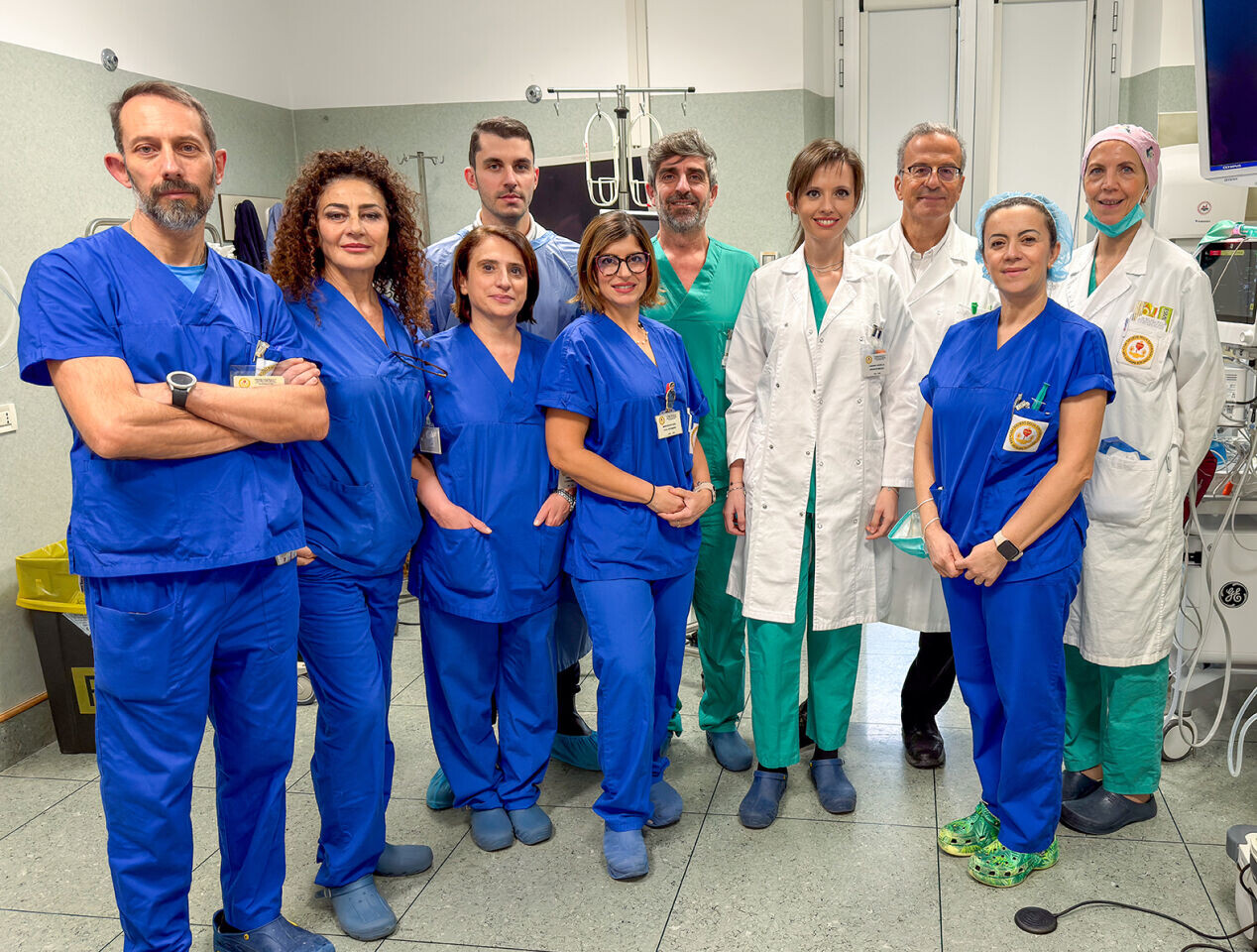 Lo staff di Gastroenterologia-Endoscopia Digestiva e Anestesia-Rianimazione 1. In divisa blu, da sinistra, gli infermieri Nicola Ritrovato, Filomena Ercolino (coordinatrice); Anna Maiuri, Enza Marchesani e Marianna Fania. In verde e bianco, da sinistra, i medici di Gastroenterologia Marco Gentile, Rossella Cubisino, Francesco Perri (direttore) e Stefania Schinco, medico anestesista. In camice azzurro, dietro, Francesco Ronchi, product secialist di Erbe Italia srl