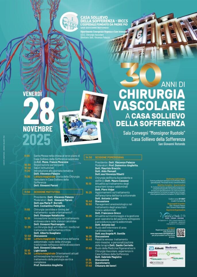 L’Unità di Chirurgia Vascolare dell’IRCCS Casa Sollievo della Sofferenza celebra il trentesimo anniversario dalla sua inaugurazione, avvenuta il 17 ottobre 1995 con la benedizione di Monsignor Riccardo Ruotolo, allora presidente dell’Opera di Padre Pio.
