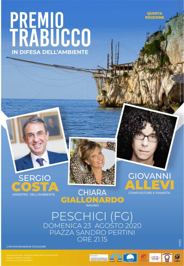 Il sindaco Franco Tavaglione, a nome dell’Amministrazione Comunale di Peschici, rende pubblici i nomi dei premiati. Nel corso della serata, il prestigioso “Premio Trabucco” verrà assegnato a Sergio Costa, Ministro dell’Ambiente, e a Giovanni Allevi, compositore e pianista di fama internazionale.